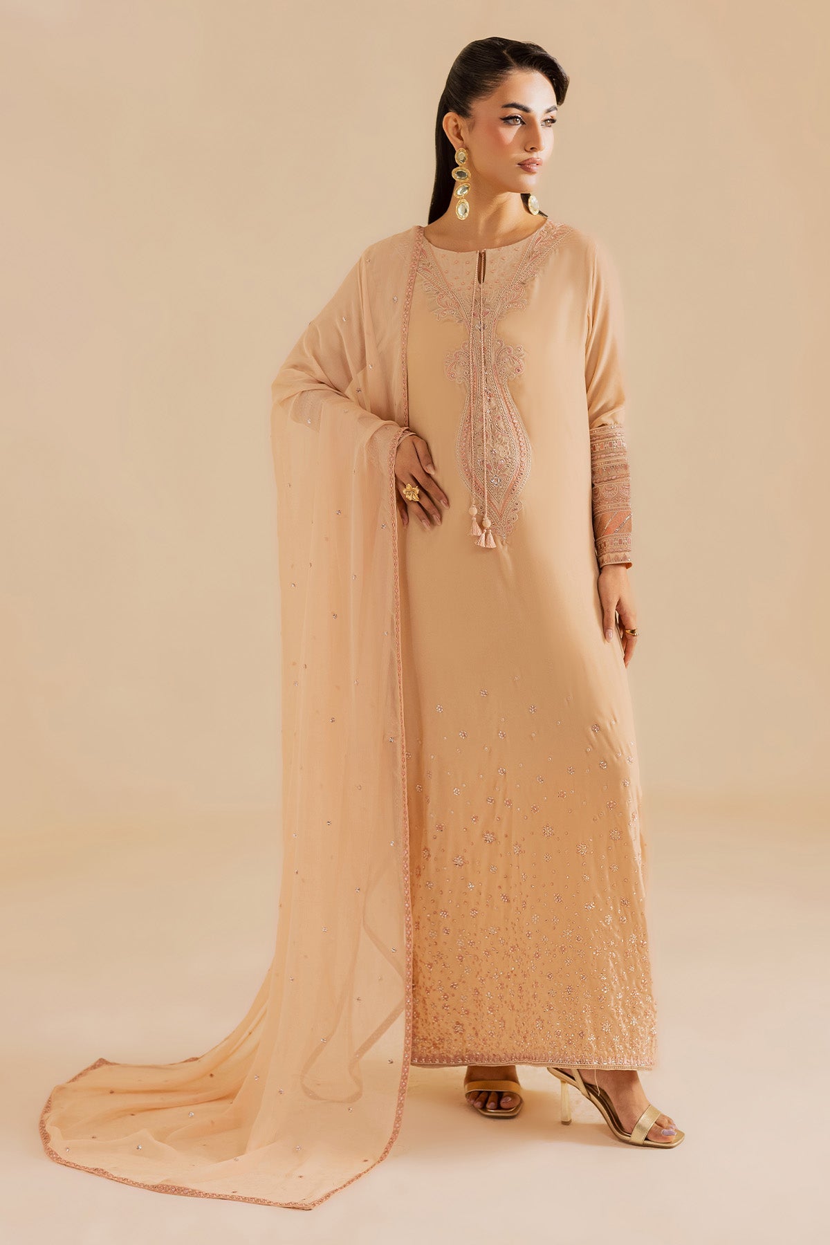 Nureh a renowned Pakistani fashion brand, has consistently captivated the hearts of fashion enthusiasts with its exquisite designs and impeccable craftsmanship. One such masterpiece that has garnered immense admiration is the NP-730 Velvet Stitched. This elegant ensemble, crafted from premium quality Velvet fabric is a testament to Nureh commitment to timeless style and comfort.