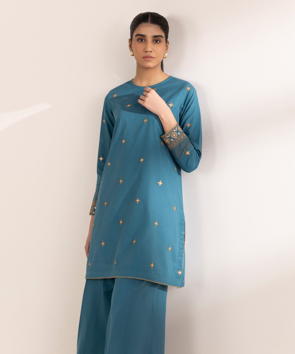 Sapphire Embroidered Crosshatch Shirt 3PTES25V232S Lehengas Pakistani Clothes is typically part of the brand's Eid 1 RTW, a highly anticipated annual release that showcases the latest trends and designs. The Eid 1 RTW is renowned for its festive and vibrant aesthetic, and the Embroidered Crosshatch Shirt 3PTES25V232S embodies this spirit perfectly.